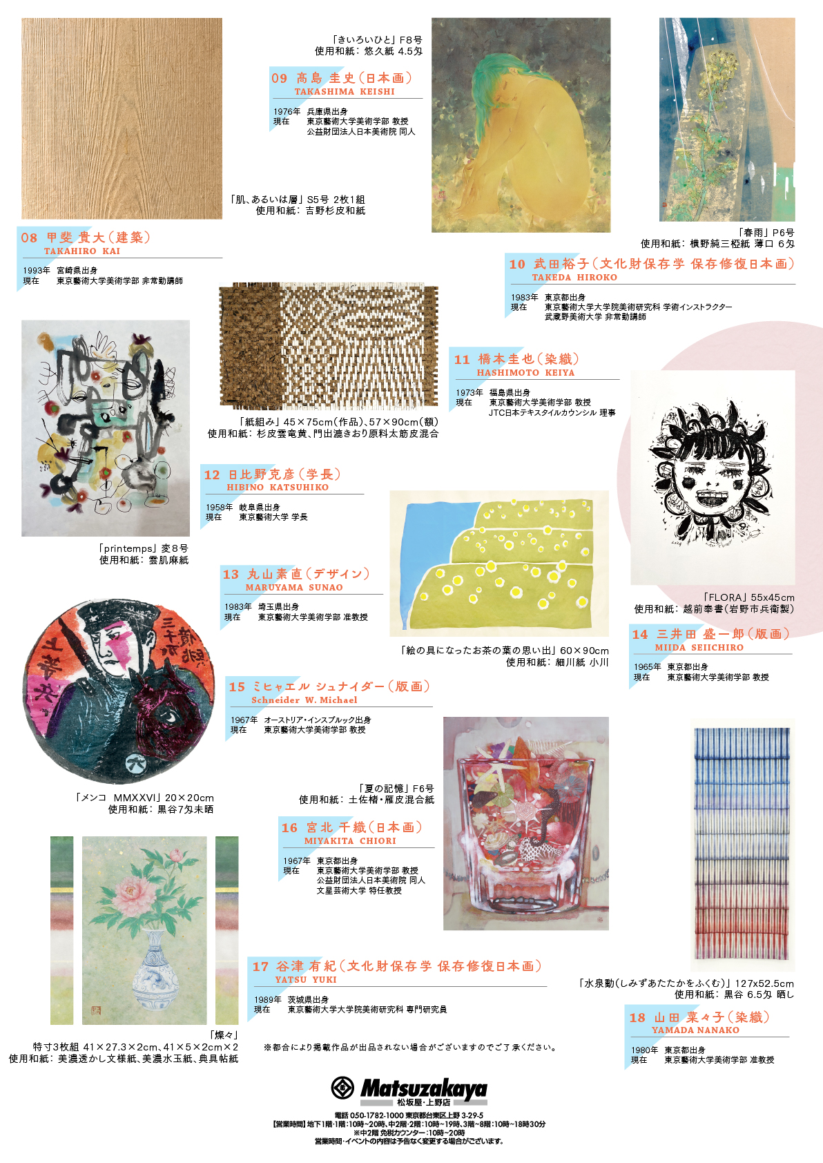 ▷Artists AOKI, Asuka/AOYAMA, Keiko/ANDO, Katsuya/OSHIMA, Naoya/OHBA, Takafumi/OHMAMA, Kenji /OKAJI, Killi/KATO, Takeshi/KIMURA, Mina/SATO, Yutaka/SHIINO, Rina/SHIMAZAKI, Natsuyo/SUE, Tomoko/SUGIYAMA, Kei/SEO, Kokoro/TANAKA, Toshiyuki/TAMURA, Yukiho/TANNO, Kaori/CHEN, Tian Yi/NAKAMURA, Kazuyo/NOMURA, Naoko/HAYASE, Rei/MAEDA, Yume/MIZUKOSHI, Chihiro/YAMAGUCHI, Yukiko/YONEMUSHI, Shiho/YOMOGIDA, Aya/LIN, Mingjun/WATANABE, Minami/WARAYA, Tomohide
